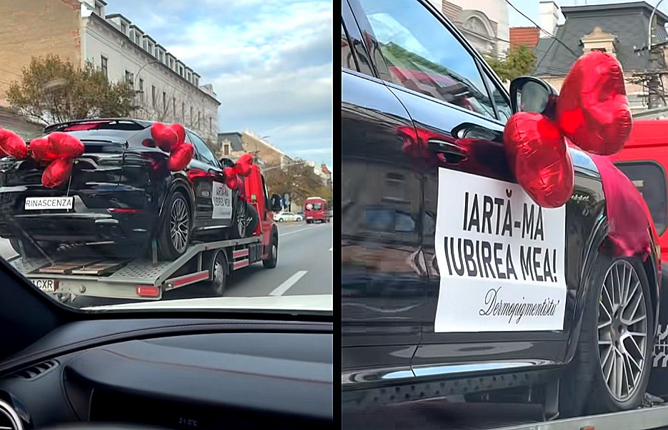 O mașină plină de inimioare și cu mesajul IARTĂ-MĂ IUBIREA MEA e căruțată pe străzile din Cluj-Napoca, iar cetățenii se întreabă dacă nu cumva s-a ridicat prea mult ștacheta la capitolul iertare.