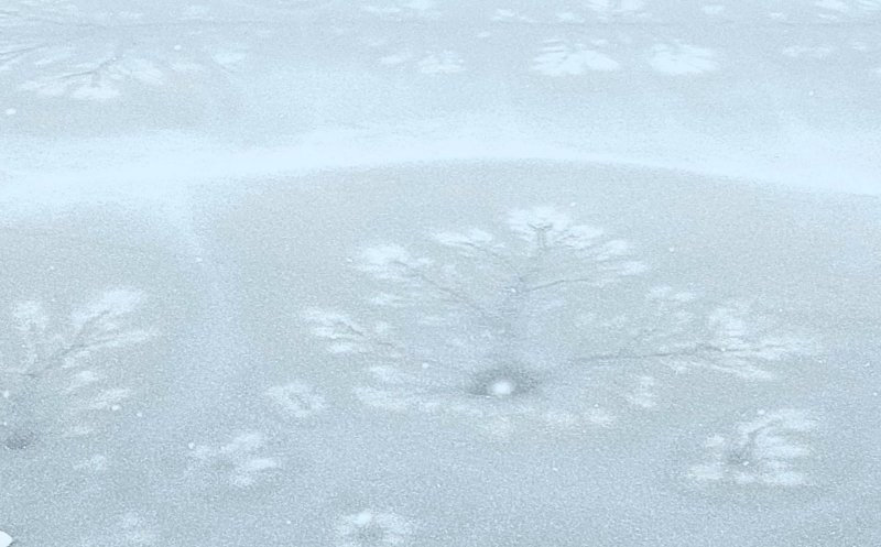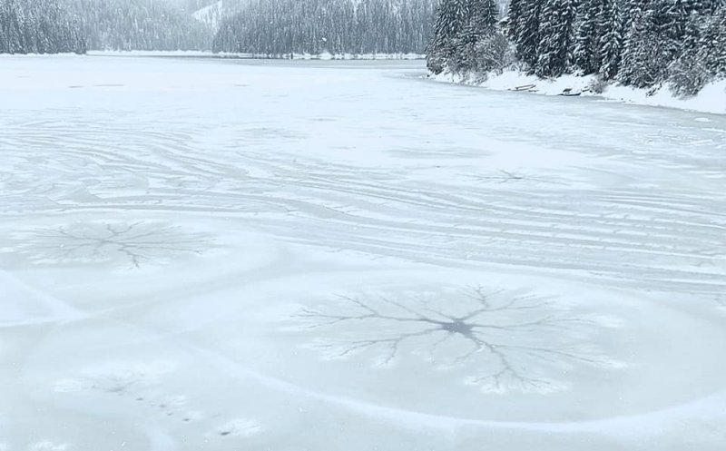„Fenomen rar pe Lacul Beliș: gravură naturală pe suprafața înghețată a apei!