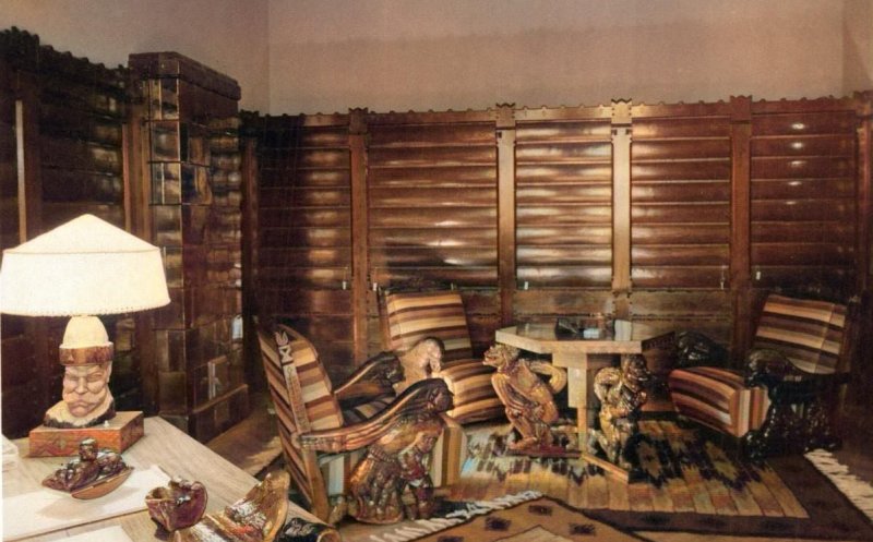 La amenajare s-au folosit lucrarile a mai multor artisti ardeleni, precum Szervátiusz (mobilierul sculptat) si Szopos Sándor. (Sursa: Amintiri din vechiul Cluj).