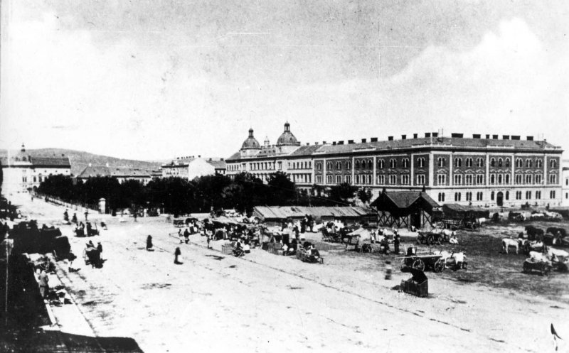 Zona a fost folosita drept piata de vite, pasune dar si ca depozit de gunoaie, fiind o zona destul de neglijata. Prima cladire importanta ridicata in piata a fost cazarma Sf Gheorghe (anii 1834-1837), actualul Comandament al Armatei Romane (proiectant: capitanul Goró Lajos). A urmat apoi biserica reformata cu doua turnuri, biserica cea mai importanta a hostezenilor, ridicata in perioada 1827-1852, dupa modelul bisericii din Debrecen, inlocuind vechea biserica amplasata unde se afla Institutul Teologic Reformat si distrusa de un atac al tatarilor. A fost finalizata sub conducerea arhitectului Kagerbauer Antal (care a proiectat si vechea primarie, biserica Sf Petru, parte a palatului Bánffy de la Bontida etc).