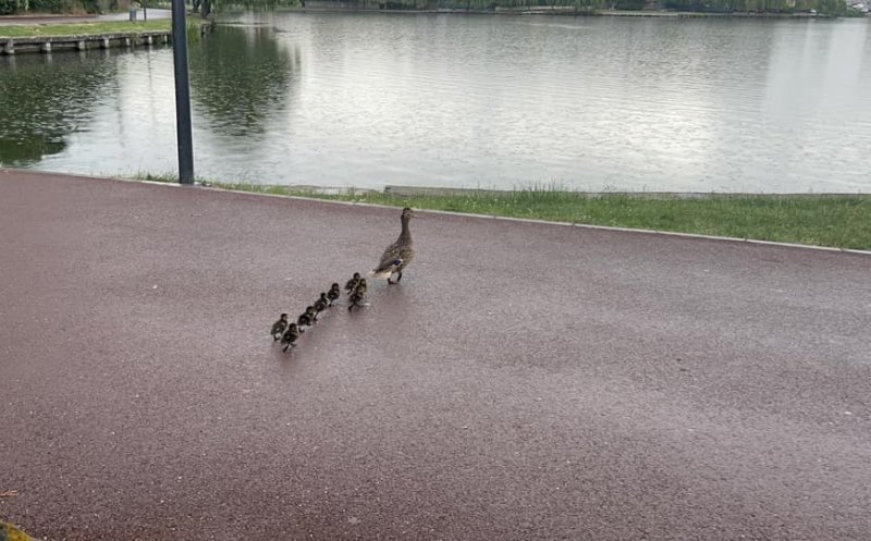 O operațiune neobișnuită a avut loc, miercuri dimineață, în centrul orașului, unde o familie de rațe, formată dintr-o femelă și cei nouă pui ai săi, au fost ghidați și mutați cu succes din curtea unei instituții bancare către Iulius Park.