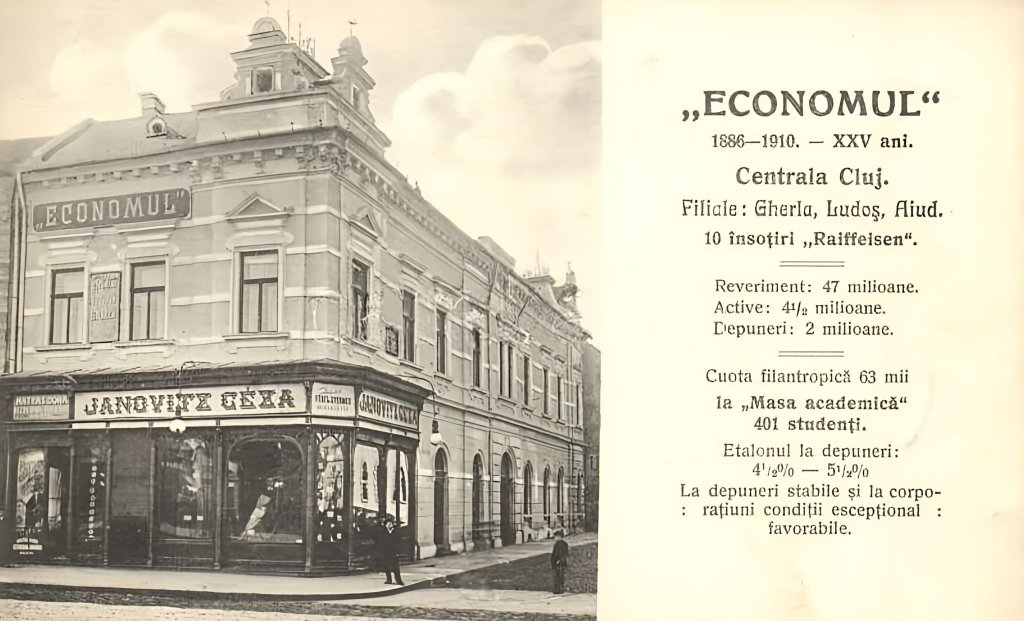 Cladirea Banc Post a fost sediu de banca inca din 1888: aici a functionat timp de 60 ani "Economul" (infiintat in 1886), prima institutie financiara fondata de elita romana din Cluj. A fost dizolvata in 1948 in timpul preluarii puterii de catre comunisti dupa ce a supravietuit, in acelasi loc, ambele razboaie. A fost prima banca de pe teritoriul Romaniei care a promovat miscarea cooperatista in stil "Raiffeisen" (fotografie din 1910).