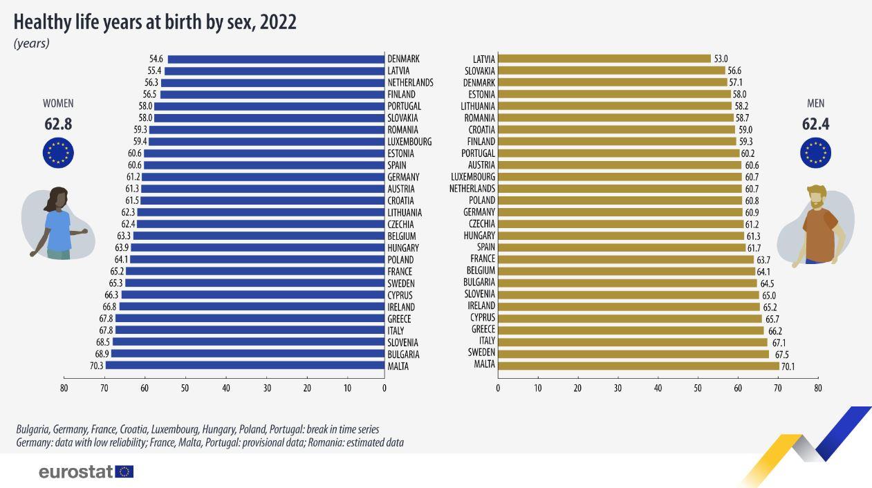 Dintre țările UE, Malta a înregistrat cel mai mare număr de ani de viață sănătoasă la naștere în 2022 pentru femei (70,3 ani), înaintea Bulgariei (68,9 ani) și Sloveniei (68,5 ani).