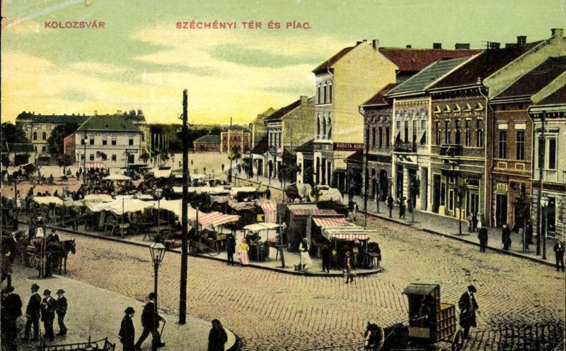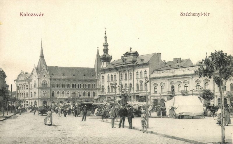 "Constructiile au aparut doar la sfarsitul secolului XIX; in 1867 a fost denumita piata Széchenyi dupa statuia dedicata lui Széchenyi István, fondatorul Academiei de Stiinte Maghiare si promotorul dezvoltarii economice a Ungariei. Odata cu linia ferata importanta zonei a crescut si piata a fost amenajata, dar tot zona de targ a ramas. Una dintre cladirile importante (vizibila in centrul imaginii color, in fundal) a fost centrul de scrima, unde si-au inceput cariera multi sportivi de renume. Zona a ramas practic neschimbata pana dupa 1945 fiind epicentrul targurilor unde hostezenii veneau sa-si vanda produsele iar clujenii se aprovizionau zi de zi. Fotografiile sunt din 1890, 1910, 1911, 1914", scrie András Vajda pe grupul de Facebook Amintiri din vechiul Cluj.