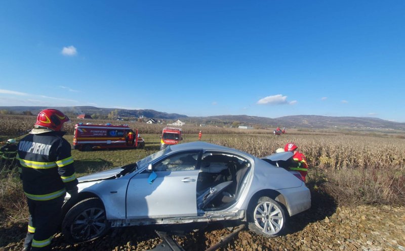 Foto Mașină SPULBERATĂ de trenul Cluj-Napoca - Galați. Șoferul autoturismului, transportat la spital cu elicopterul SMURD