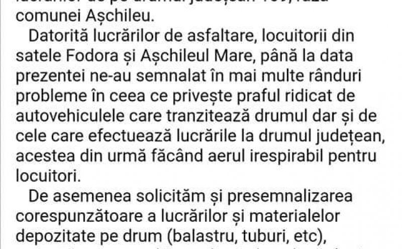 În urmă cu mai bine de o lună, PRO România Așchileu a solicitat Consiliului Județean Cluj luarea tuturor măsurilor necesare pentru diminuarea poluării cu praf datorată lucrărilor de modernizare a DJ109, precum și presemnalizarea corespunzătoare a acestor lucrări și a materialelor depozitate pe drum, care pun în pericol siguranța cetățenilor care circulă pe tronsonul menționat. Deși, în adresa de răspuns, Consiliul Județean Cluj își cerea scuze pentru situația creată, încă nu a fost implementată nicio măsură pentru reducerea disconfortului cetățenilor.