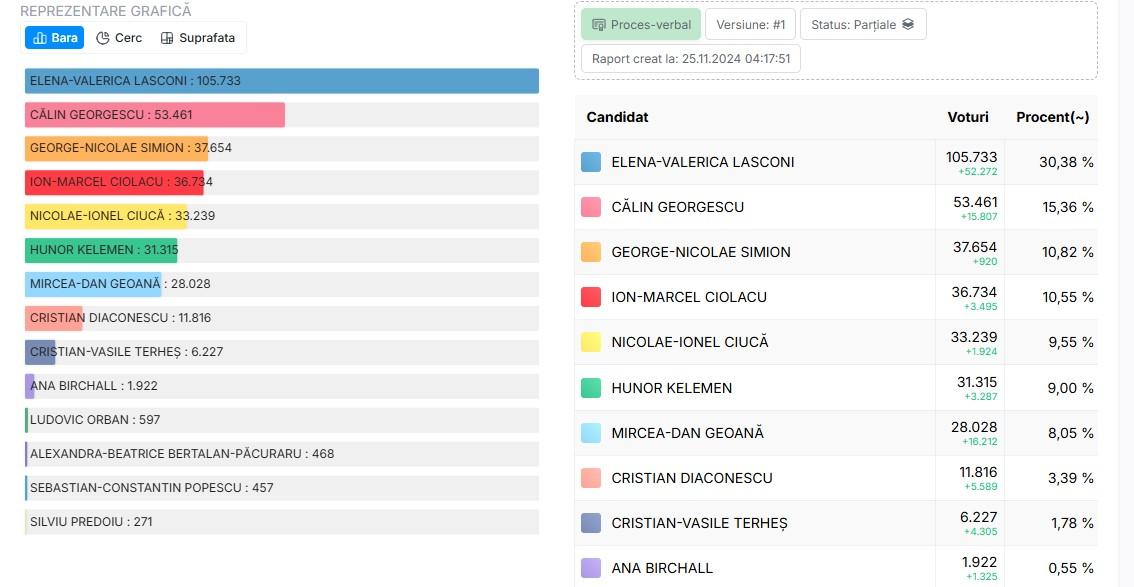Breaking news Foto REZULTATE FINALE TUR I alegeri prezidențiale: CĂLIN GEORGESCU - 22,94 %, ELENA LASCONI - 19,18 % MARCEL CIOLACU 19,15 % / Situația pe Cluj