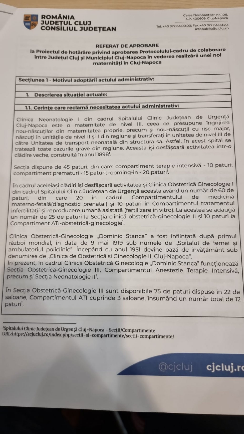 Potrivit referatului de aprobare ce va fi depus la forul administrativ județean, se consideră că municipiul Cluj-Napoca are nevoie de o maternitate nouă, construită la standardele medicale și europene actuale care să asigure condiții optime de lucru pentru personalul medical, astfel încât mamele și nou-născuții să beneficieze de servicii medicale adecvate.