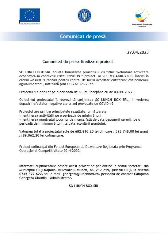 Comunicat de presa finalizare proiect SC LUNCH BOX SRL