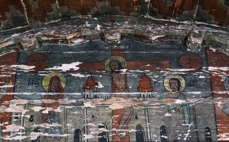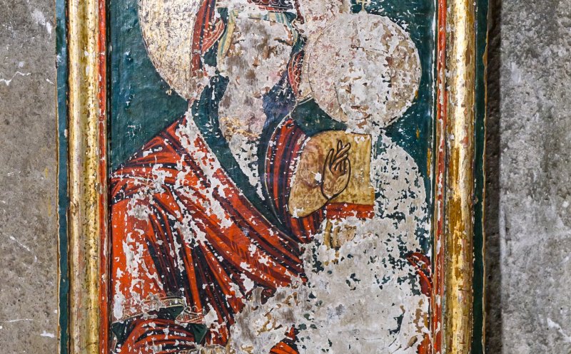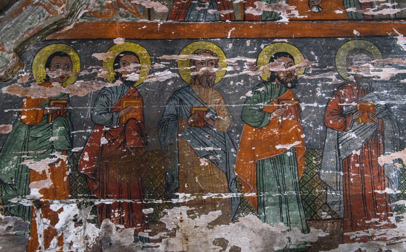 Iconostasul vechi, dovadă stând existența a doar două intrări, este pictat cu şirul celor 12 Apostoli și Iisus Arhiereu, registru încununat de o Răstignire, unde remarcăm soarele și luna, reprezentate în culori sângerii. În pronaos, Pilda fecioarelor și o friză a sfintelor mucenițe sunt puternic deteriorate.