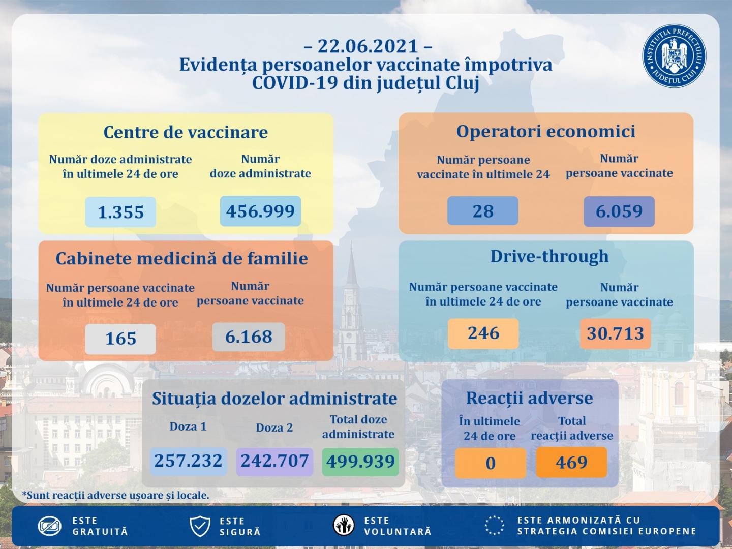 Până marți după-amiază, la Cluj au fost vaccinate împotriva noului coronavirus 499.939 persoane, dintre care 242.707 cu ambele doze. Din cele 1.794 de persoane care s-au imunizat în cursul zilei de marți, 1.355 s-au vaccinat în centrele din județ și 246 de persoane au primit vaccinul direct în mașină, în centrul drive-thru de la Sala Sporturilor din Cluj-Napoca, unde s-a ajuns la un total de 30.713 vaccinări. De asemenea, alte 165 de persoane s-au vaccinat marți în cabinetele medicilor de familie și 28, în punctele de vaccinare deschise de operatorii economici. În urma administrării vaccinurilor nu au fost semnalate recții adverse, astfel că, de la începutul campaniei de vaccinare, la Cluj au fost raportate 469 de reacții adverse în urma administrării vaccinurilor.