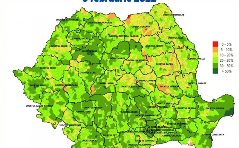 Din cele 10 localități cu cea mai mare acoperire vaccinală, 9 sunt comune. În România procentul de vaccinare în rural este de 29.69%, în urban de 41.69% și de 43.45% în municipii. De asemenea, la data de 2 februarie, procentul vaccinărilor în România era de 41.85% din populația generală - 44, 85% din populația eligibilă (cu vârsta peste 5 ani) și 50,43% din populația adultă (peste 18 ani).