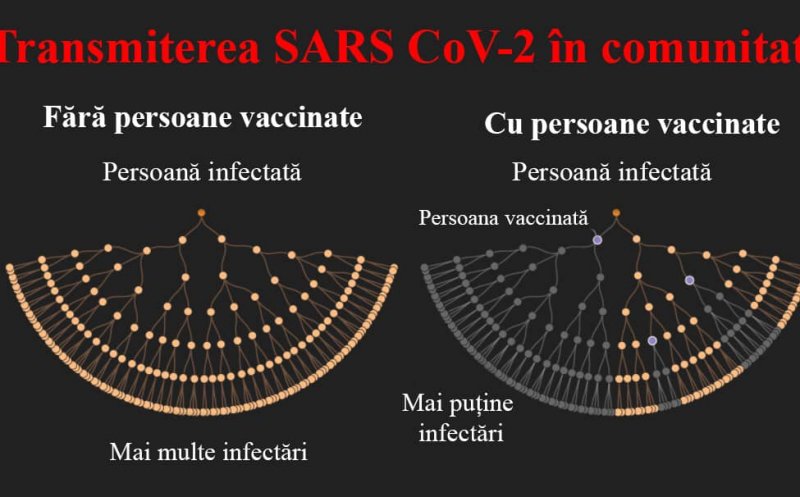 Reprezentanții Ro-Vaccinare au explicat, printr-o ilustrație, modul în care se răspândește virusul, în cazul persoanelor vaccinate și a celor nevaccinate