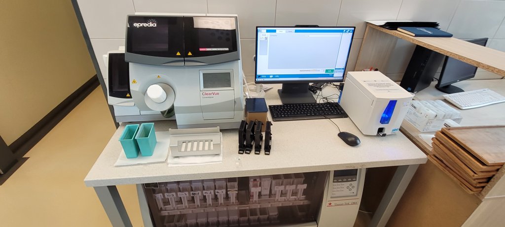 Laboratorul de Anatomie Patologică a fost dotat cu echipamente performante, inclusiv roboți de procesare a probelor, microtoame, sisteme automate de colorare și scanere de lame histologice. Scannerul de lame reprezintă unul dintre cele mai importante elemente ale investiției, permițând digitizarea completă a preparatelor histologice.