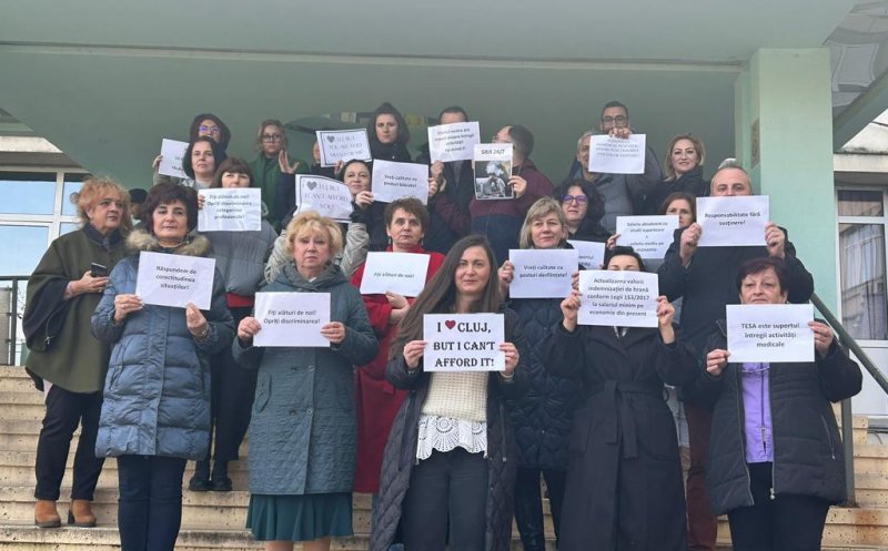 Angajați din rândul personalului nemedical al Spitalul Clinic de Recuperare Cluj-Napoca au protestat, joi, în fața spitalului, în semn de solidaritate cu mișcarile similare care au loc la nivel national, pentru a atrage atenţia asupra decalajelor salariale din sistemul public.