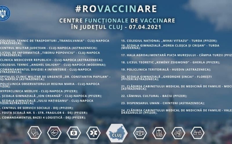 Pe platforma națională de programare pentru vaccinarea anti-COVID la Cluj sunt disponibile, pentru înscrierea pe listele de așteptare, peste 40 de puncte de vaccinare, însă nu toate sunt deja funcționale. Iată lista centrelor în care se vaccinează și ce ser se administrează în fiecare: