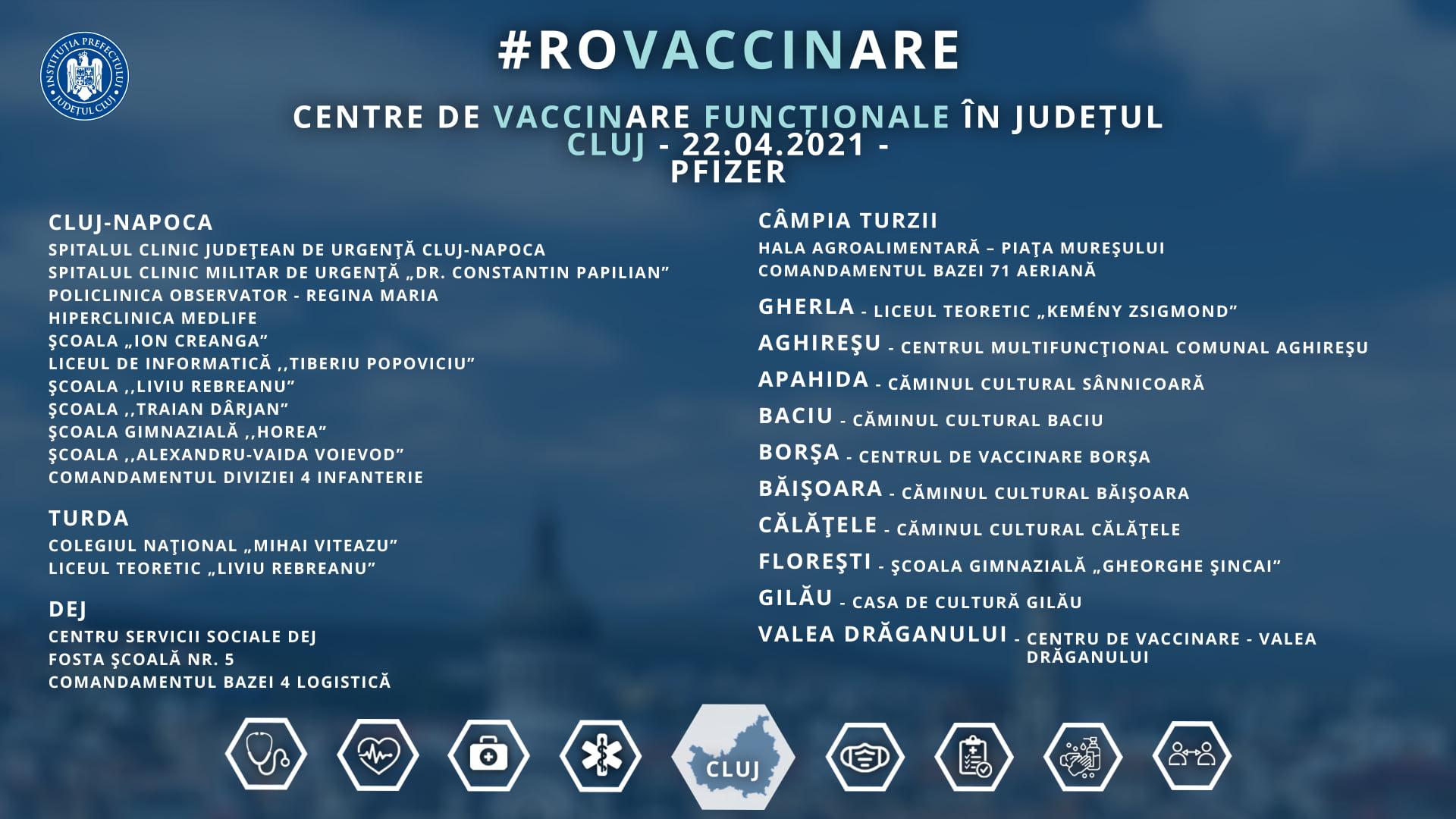 De asemenea, existau 80 de doze Moderna în centrul din Huedin, peste 50 în Mociu și aproape 100 în centrul Școala Gimnazială Horea, Cloșca și Crișan - sala de sport din Turda. Totodată, alte aproape 5.000 de doze de vaccin de la AstraZeneca sunt disponibile în centrele din județ.