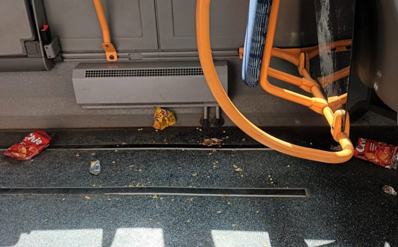 ”Bună ziua vreau să vă arăt și aici dezastrul pt. că mirosul nu se simte. De pe linia 39”, ne scrie clujeanul supărat pe mizeria din autobuz. În fotografie se observă niște gunoaie aruncate pe jos în mijlocul de transport public.