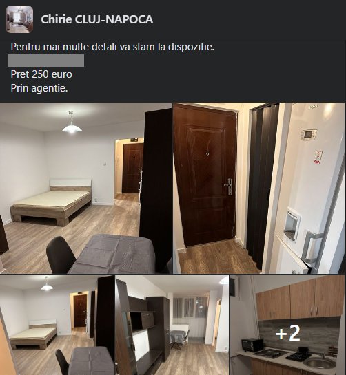„Închiriez garsonieră în zona Gheorgheni. Preț: 230 euro. Pentru detalii sau vizionări, aștept mesaj” e scris în anunțul de închiriere de pe grupul de Facebook - CHIRIE Cluj-Napoca, care cuprinde peste 14.000 de utilizatori.