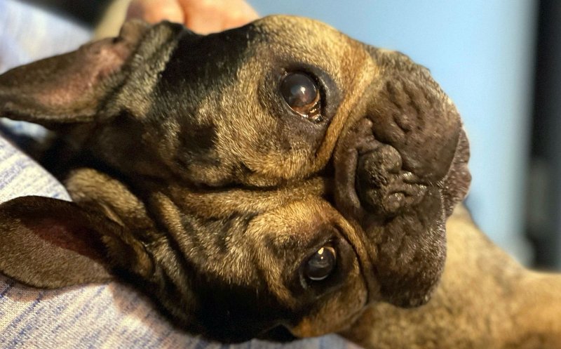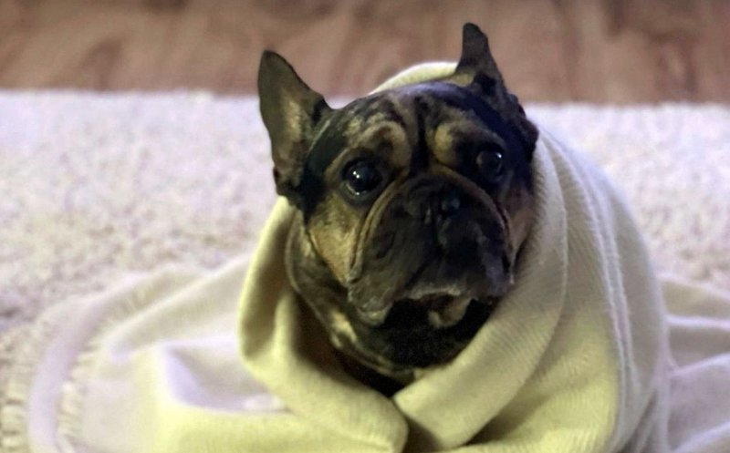 Micul Arni, un bulldog francez, se recuperează după operația în premieră la Cluj de implantare a unui stimulator cardiac.
