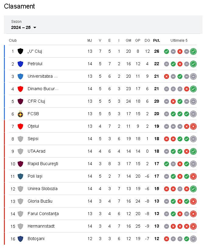Universitatea Cluj se află acum pe primul loc al SuperLigii după 13 etape cu 26 de puncte acumulate, la patru lungimi în fața formației aflate pe poziția secundă, Petrolul (22 de puncte). De partea cealaltă, în acest moment, FCSB ocupă poziția a 6-a a clasamentului, cu 20 puncte.