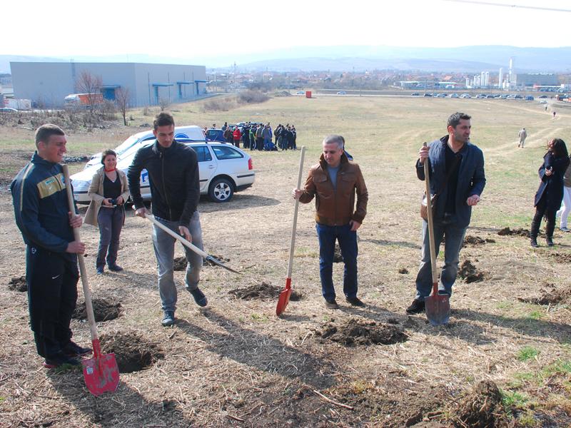 Suflă un vânt teribil pe dealul de la marginea oraşului, undeva în capătul Bulevardului Muncii. Au trecut puţine minute peste ora 11:00, cea stabilită iniţial, iar sportivii se lasă încă aşteptaţi. Apar, în cele din urmă, şi pun instant mâinile pe lopeţi. Printre ei se evidenţiază tehnicianul lui "U", Claudiu Niculescu, fundaşul central Lukasz Szukala, dar şi directorul executiv Felix Grigore. Au adoptat o ţinută elegantă, însă nu s-au dat în lături de la muncă. Din contră, "Clau-coach" a fost cel mai harnic dintre cei prezenţi şi tot el şi-a permis să destindă atmosfera. "Vreau o pauză de masă!", a spus amuzat omul care încă speră să ducă Universitatea pe un loc de cupă europeană. Ceilalţi zâmbesc de pe margine.