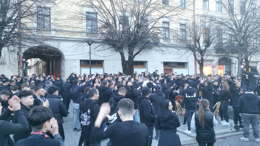 Sute de suporteri ai Universității s-au strâns în centrul orașului pentru a pregăti partida. Timp de minute bune, cei prezenți au cântat, iar cât mai curând se vor îndrepta spre stadion, unde va avea loc disputa.