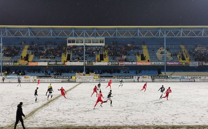 Pe durata pauzei, un strat gros de zăpadă s-a așternut pe gazonul de la Mediaș, iar actul secund al întâlnirii s-a jucat în condiții speciale.