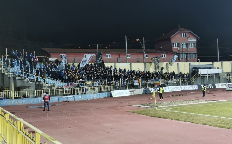 Susținuți de întreaga Peluza I a stadionului din Mediaș, "studenții" au intrat pe gazon cu un mesaj de susținere pentru colegul lor accidentat, Florinel Mitrea.