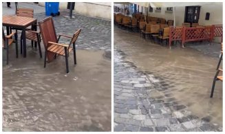 Piața Muzeului din municipiul Cluj-Napoca a fost inundată, joi dimineață, din cauza unei conducte de apă avariată.
