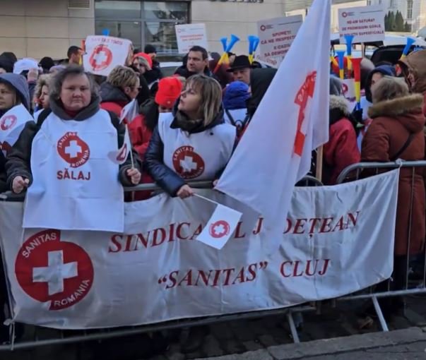 Sute de sindicalişti Sanitas, inclusiv de la Cluj, protestează, miercuri, în faţa Ministerului Sănătăţii, fiind nemulţumiţi de scăderea sporurilor salariale din sistemul medical.