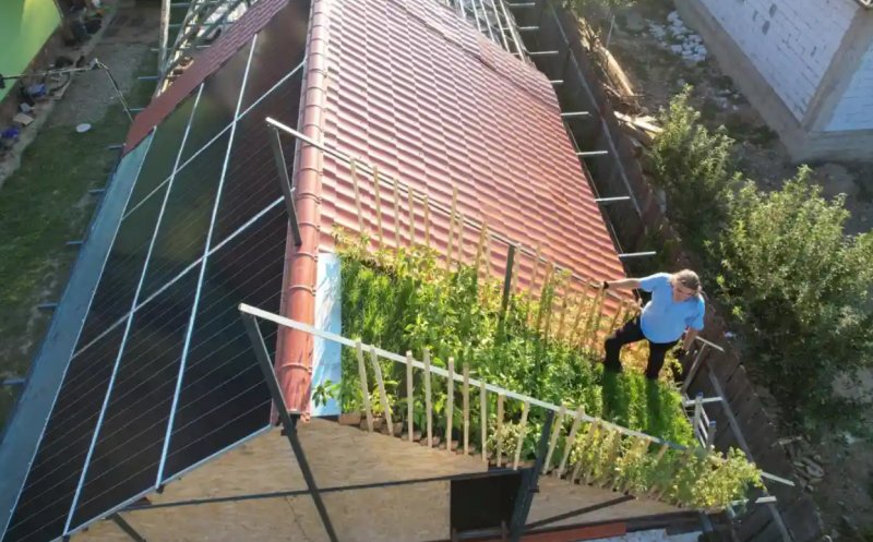 Mihai Oltean, un informatician din Cugir, județul Alba, a transformat acoperișul casei sale într-o construcție multifuncțională: pe partea sudică a montat panouri fotovoltaice, iar pe cea nordică a amenajat o mică grădină unde cultivă roșii, ardei și gogoșari.