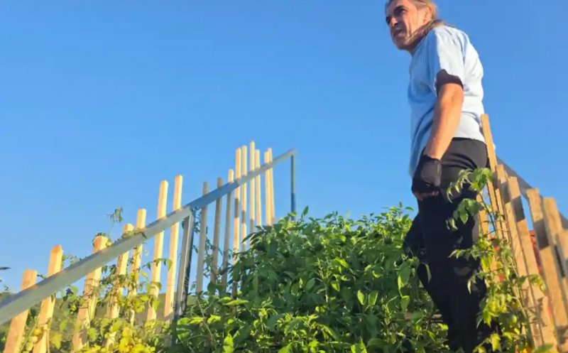Pentru grădină, a folosit jgheaburi metalice în care a plantat legumele. Unghiul acoperișului, de 38 de grade, a fost calculat astfel încât acestea să se suprapună perfect. A cultivat roșii, ardei și gogoșari, care au crescut bine, în timp ce salata și spanacul au avut o dezvoltare mai slabă. Recent, a semănat și grâu, care a început să răsară promițător.
