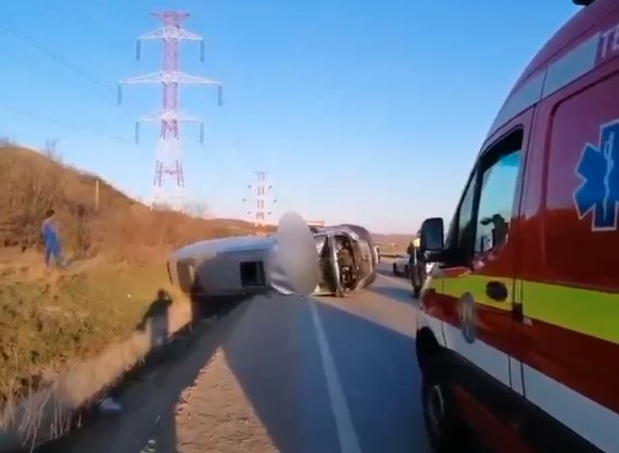 În urma impactului, microbuzul cu 10 ocupanți s-a răsturnat pe partea carosabilă.