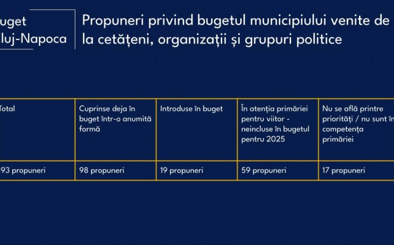 "Am primit 193 de popuneri, în urma dezbaterii publice. 98 erau cuprinse în buget, într-o formă sau alta. 19 propuneri sunt noi și am găsit soluție financiară. 58 rămân în atenția noastră (ex. Hotel Continental). 17 nu sunt în competența noastră (ex. Sala Horia Demian). Acum, câteva detalii despre cele 19 propuneri: din partea societății civile - 1 milion lei pentru inelul verde metropolitan, am preluat propuneri de la UDR și PNL - sală de concerte pentru Liceul Sigismund Toduță, Grădinița Neghiniță sau cea de la Pata Rât, în privința propunerilor de la PSD - am inclus partea iluminatului arhitectural, creșterea finanțării pentru spitale, podul Locomotivei, grupul consilierilor USR - construire creșă în cartierul Între Lacuri, modernizare Mica Sirenă și creșa Clopoțica, suplimentare Bike Sharing, consilierii AUR - SF la modernizare Liceul Romulul Ladea, SF Colegiul Energetic, UDMR - au trimis propunerile înainte de elaborarea bugetului. Cu alte cuvine, am încercat în limita bugetului și a viziunii dezvoltării orașului să adunăm toate propunerile. Toate proiectele depuse rămân în atenția noastră, când vom avea rectificare de buget vom include o parte dintre propuneri", a declarat primarul Emil Boc, la ședința de aprobare a bugetului.