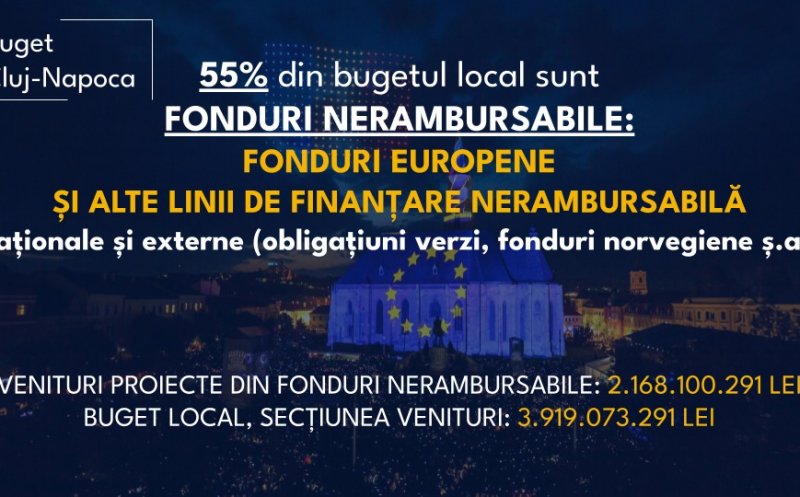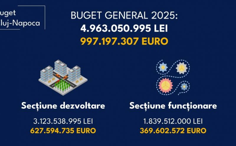 Bugetul municipiului Cluj-Napoca pentru anul 2025 este de 4.9 MILIARDE LEI (997 milioane euro). Este cel mai mare buget din România, după București. Se înregistrează o creștere de 4.42% față de anul 2024. Un procent de 55% din bugetul Clujului provine din fonduri UE.