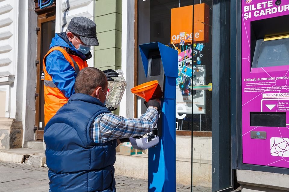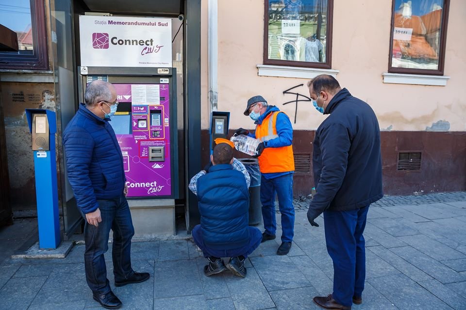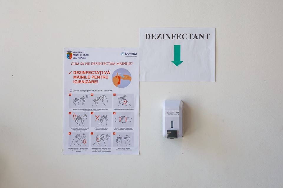 De asemenea, până acum au fost montate 130 dispensere cu soluție dezinfectantă la blocurile mari din cartierele Mănăștur și Mărăști.