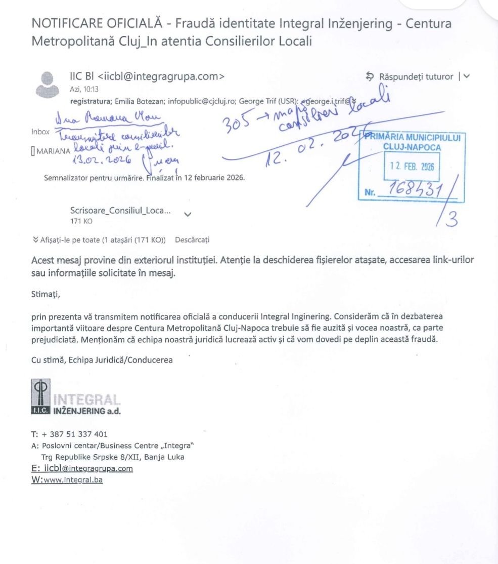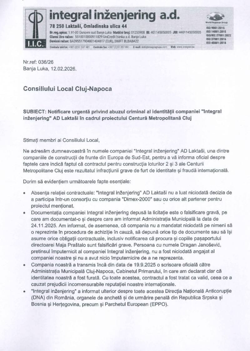 Compania bosniacă Integral Inženjering a transmis o notificare oficială consilierilor locali din Cluj-Napoca înaintea ședinței care urmează să aibă loc luni, 16 februarie 2026, document în care susține că nu au participat niciodată la un consorțiu pentru proiectul Centurii Metropolitane și că documentele depuse în licitație în numele companiei ar fi falsificate.
