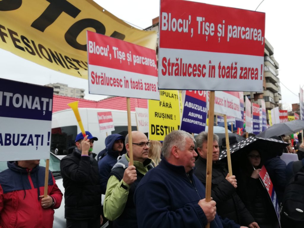 Aproximativ 200 de sindicaliști ai aeroportului clujean au fost prezenți în stradă, cu pancarte inscripționate cu mesaje anti-Tișe: "Blocu', Tișe și parcarea/ Strălucesc în toată zarea!", "Stop abuzului asupra aeroportului", "Imnul intonați/ Pe noi ne abuzați!". De asemenea, angajații aeroportului clujean au scandat "Alin Tișe, nu uita/ Clujul nu-i moșia ta", "Vrem dezvoltare/ Nu blocare!" sau "Noi nu urlăm/ Noi protestăm!". Manifestarea sindicaliștilor a durat o oră și s-a desfășurat fără incidente.