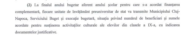 În vederea acordării finanțării pentru susținerea activităților culturale ale elevilor, părintele/ tutorele/ reprezentantul legal va depune la unitatea de învățământ unde elevul este înscris, în termen de 30 de zile de la începerea cursurilor scolare, o cerere, însoțită de un extras de cont. Unitățile de învățământ vor solicita Municipiului Cluj-Napoca deschiderea de credite bugetare necesare efectuării plății finanțării activităților culturale ale elevilor. Municipiul Cluj-Napoca, prin Serviciul Buget și execuție bugetară, în urma verificării documentelor transmise de către unitatea de învățământ, va efectua deschiderea de credite bugetare. Unitățile de învățământ vor face plata către beneficiarii finali în conturile specificate în extrasele de cont. Sumele pentru susținerea activităților culturale ale elevilor din clasele a IX-a pot fi utilizate pe tot parcursul anului școlar, inclusiv pe perioadele vacanțelor școlare, pentru achiziționarea de servicii și evenimente culturale. Până cel tarziu la data de 30 septembrie a anului școlar următor, părintele/ tutorele/ reprezentantul legal al elevului va depune la unitatea de învățământ dovada utilizării sumelor primite pentru sustinerea activităților culturale (chitanțe, bonuri fiscale, ordine de plată etc.), iar suma neutilizată va fi virată în bugetul unității de învățământ.