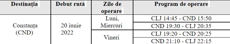 În data de 20 iunie 2022, de pe Aeroportul Internațional Avram Iancu Cluj se vor relua zborurile regulate sezoniere spre Constanța, operate de către compania aeriană Blue Air. Zborurile spre litoralul Mării Negre vor fi operate cu 3 frecvenţe săptămânale, în zilele de luni, miercuri şi vineri, după cum urmează: