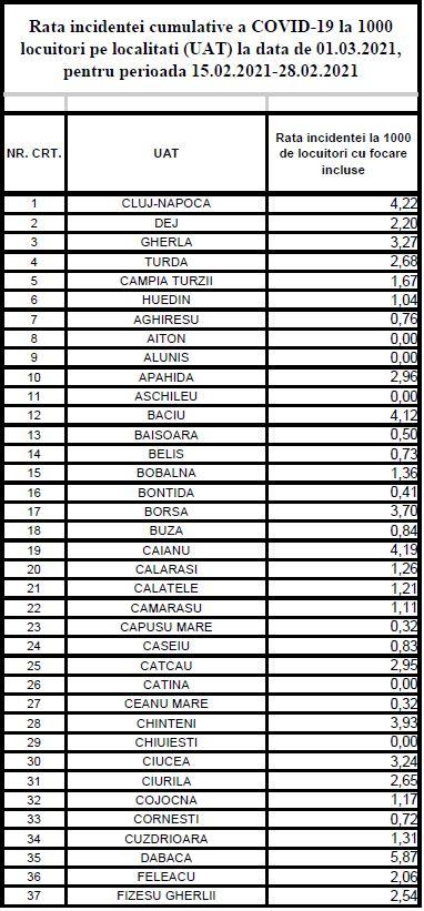 "Incidența de luni este determinată de ajustări la final de lună în platforma CoronaForm, prin alocări restante, alocarea cazurilor pozitivate la noi, dar cu domiciliu în alt județ, deoarece își desfășoară activitatea în Cluj-Napoca conform datelor rezultate din anchete epidemiologice și alocări la finalizarea unor anchete epidemiologice din ultimele zile", a transmis prefectul interimar al Clujului, Irina Munteanu.