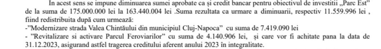 ''În urmă evaluării finale, de către experți, a exproprierilor la Parcul Est, bazată pe grilă finală a notarilor publici, avem un cost mai mic cu 11.6 milioane lei. Pentru asta, avem nevoie de rectificarea de buget, iar diferența să fie pusă pe alte investiții, precum Parcul Feroviarilor. Dacă nu cheltuim tot creditul, avem alte probleme financiare'', a declarat primarul Emil Boc, la ședința Consiliului Local.