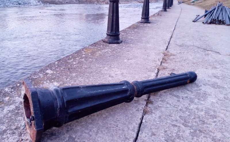 Muncitorii de pe șantierul de modernizare a malurilor Someșului avansează cu lucrările și pe malul drept: este dezmembrată şi adunată partea metalică a promenadei de pe malul apei.