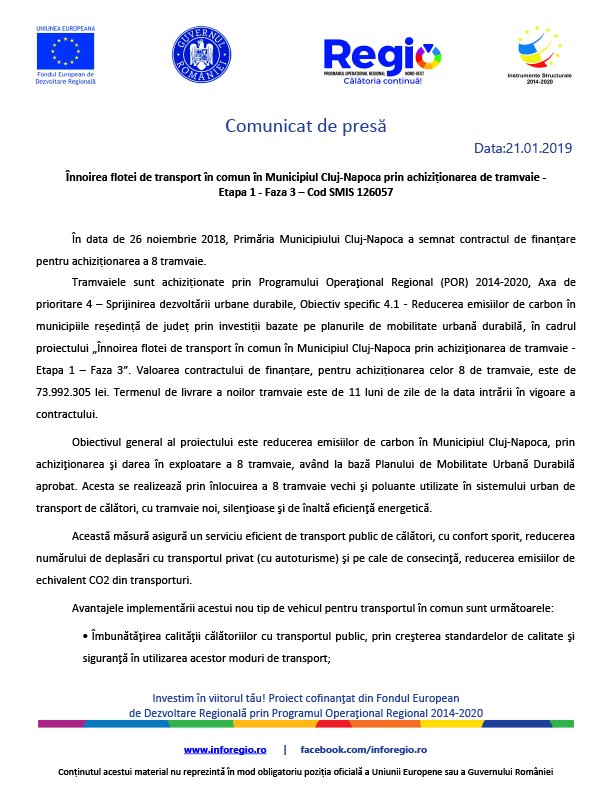 În data de 26 noiembrie 2018, Primăria Municipiului Cluj-Napoca a semnat contractul de finanțare pentru achiziționarea a 8 tramvaie.