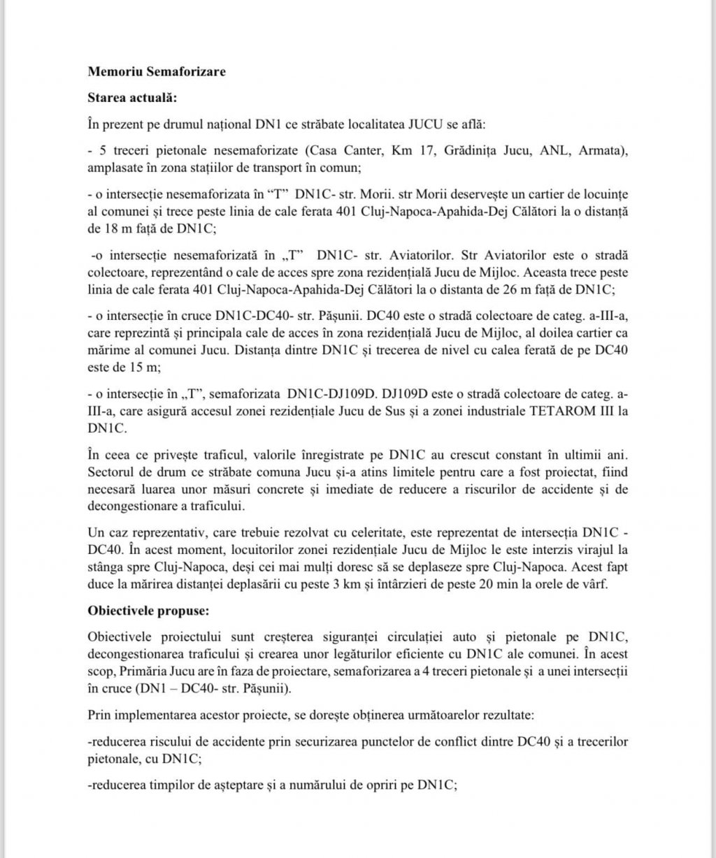 "Aș vrea să vă fac o informare celor interesați de intersecția blocată de la Jucu de Mijloc cu DN1C și pașii pe care i-am făcut pentru a semaforiza aceea intersecție, moment în care în opinia mea, va fi soluția definitivă în rezolvarea acestei probleme. Am discutat cu proiectanții care se ocupă de acest proiect de semaforizare și mi-au spus ca suntem în măsură să depunem documentațiile pentru avizarea și autorizarea acestui proiect.