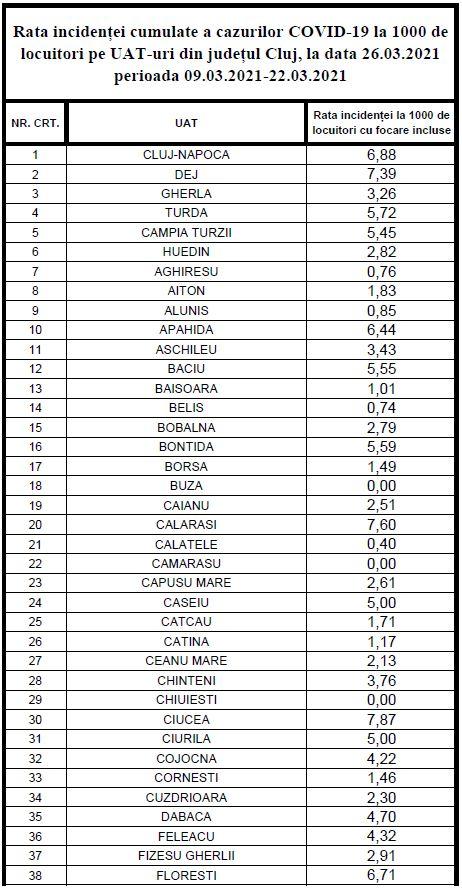Cele mai mari rate de infectare în județ - peste 10 cazuri la mie sunt în comunele Palatca -13,03 și Gârbău - 10,02 la mie, comuna Tureni se apropie de 9 (8,69), iar peste pragul de 7 au urcat comuna Ciucea - 7,87 și municipiul Dej - 7,39.