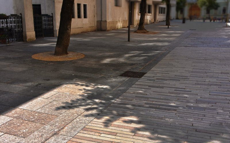 ''Proiectul prevede pavaje cu dale mari de labradorit în zonele adiacente soclurilor, precum și ”covoare” ample în fața portalelor. În zona mediană de câmp, s-a prevăzut o reinterpretare a pavajelor de piatră cubică de odinioară. Varietatea mozaicată a acestei țesături se compune din asize longitudinale de roci magmatice: diferite tipuri de andezit, trahit și bazalt. Limitele dintre acestea nu recurg la clasicele bordurări, ci se rezolvă cu profile metalice necorodabile, fixate ascuns în rost. Din motive tehnice, ecologice și de protejare a patrimoniului construit, pozarea evită complet utilizarea cimentului și a nisipului. Patul suport al pavajelor este din piatră mărunt concasată.''