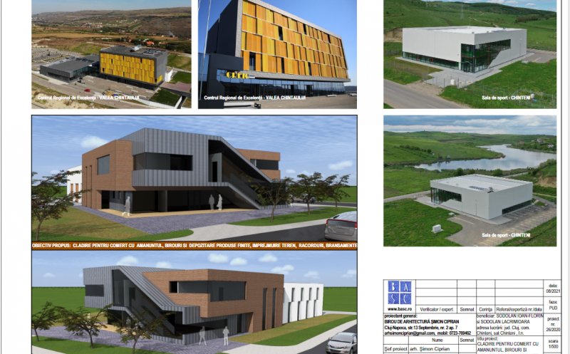 Proiectantul Ciprian Șimon a făcut o scurtă prezentare a planului urbanistic de detaliu, precizând că este vorba de o revenire în comisie, terenul fiind situat la intrarea în comuna Chinteni dinspre Cluj-Napoca, iar spațiul va funcționa ca un mixt între clădire de birouri, comerț cu amănuntul și depozitare.