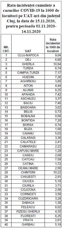 Iată incidența infecțiilor cu noul coronavirus în fiecare unitate administrativ-teritorială a județului, la data de 15 noiembrie: